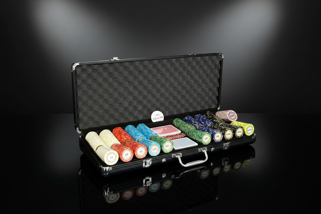 תכלת 75 יחידות ערך 10 אדום 75 יחידות ערך 5 ירוק 75 יחידות ערך 25 כחול 75 יחידות בערך 50 שחור 75 יחידות ערך 100 ורוד 25 יחידות ערך 500 צהוב 25 יחידות ערך 1000 + כפתור דילר + 2 חפיסות קלפים קרטון מידות המזוודה 500 :